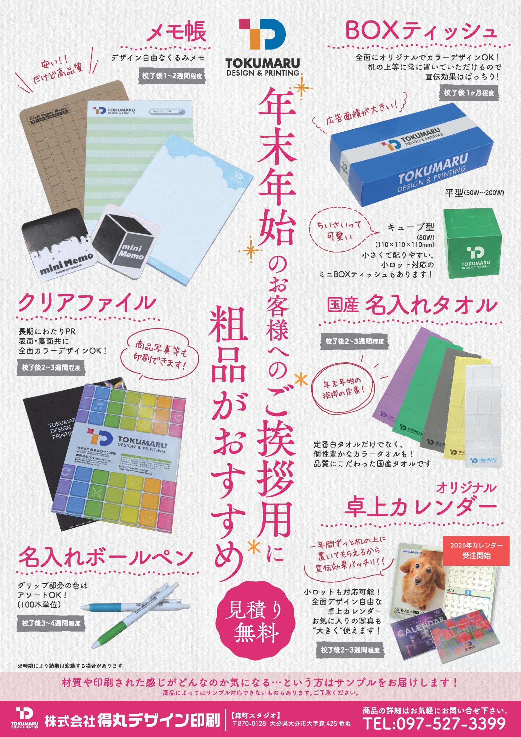 以下のようなチラシを作り、メモ帳やBOXティッシュ、卓上カレンダーやタオルなどが人気となっています。